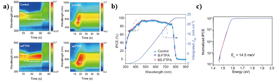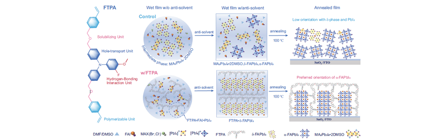 In the article "Orientated crystallization of FA based perovskite via hydrogen bonded polymer network for effective and stable solar cells", the research team successfully designed a multifunctional fluorine substituted molecule FTPA as an additive, which acts as a downforce (1) to effectively transport holes and regulate energy levels in the bulk and surface of perovskite films; (2) Inhibiting the production of multiple intermediate phases and promoting α- Oriented crystallization of FAPbI3; (3) Promoted the sustained interaction between molecules and perovskite during spin coating and annealing processes; (4) Enable molecular filling of perovskite grain boundaries to form hydrogen bonding networks, effectively stabilizing them α- FAPbI3 (Figure 1). In the end, the perovskite solar cell based on FTPA achieved an efficiency of 24.10%. In addition, unpackaged solar cells exhibit excellent stability, maintaining over 95% of their initial efficiency value after continuous illumination for 1000 hours or accelerated aging in an air environment with ≈ 50% humidity for 2000 hours. Finally, the article also demonstrates the universality of the role of FTPA molecules in forward and reverse device structures and solar cells with different perovskite compositions. This work contributes to a deeper understanding of the crystallization kinetics mechanism and control methods in the preparation process of mixed ion perovskite, and provides important insights for the molecular design of new perovskite additives.
