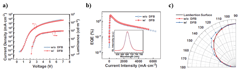 In the first article, using the Spectra EQE external quantum efficiency testing system of Ouyi Optoelectronics, the author described in detail the EQE characteristics of perovskite LEDs, including a) current brightness characteristics; b) Current EQE characteristics; c) Angle dependent EL characteristics, etc. (Figure 2).